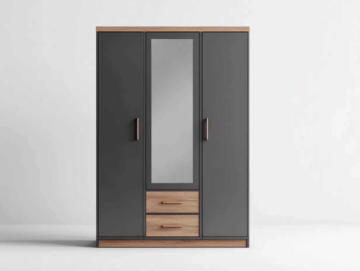 Réalisée en panneaux finition bois et surfaces gris foncé mates, cette armoire se distingue par ses éléments en chêne naturel visibles sur le plateau supérieur, la base et les façades de tiroirs. Les poignées assorties apportent une cohérence visuelle et une finition soignée.