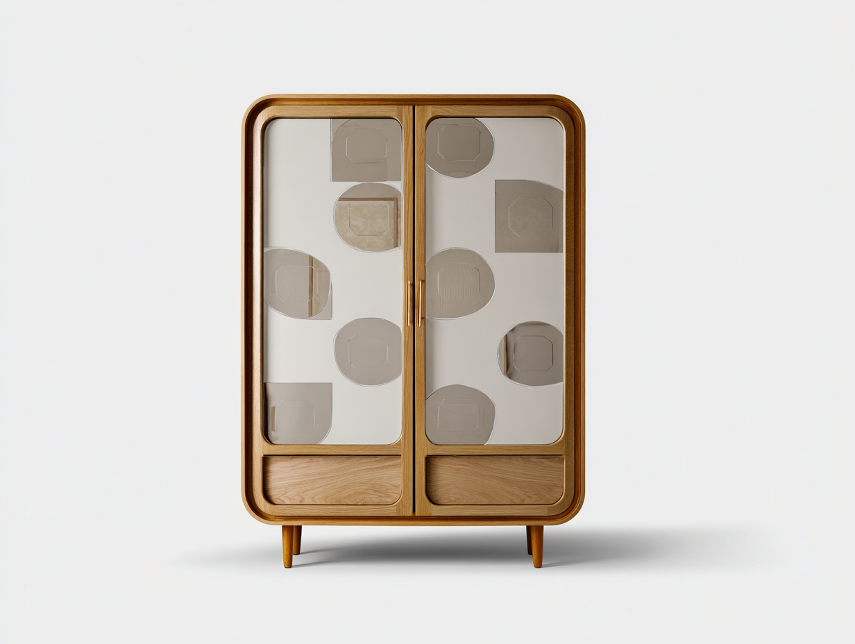 Structure réalisée en bois de couleur brun assurant stabilité et durabilité. Façades en verre de teinte beige avec finition lisse, intégrées dans un cadre en bois aux bords arrondis pour une esthétique soignée.
