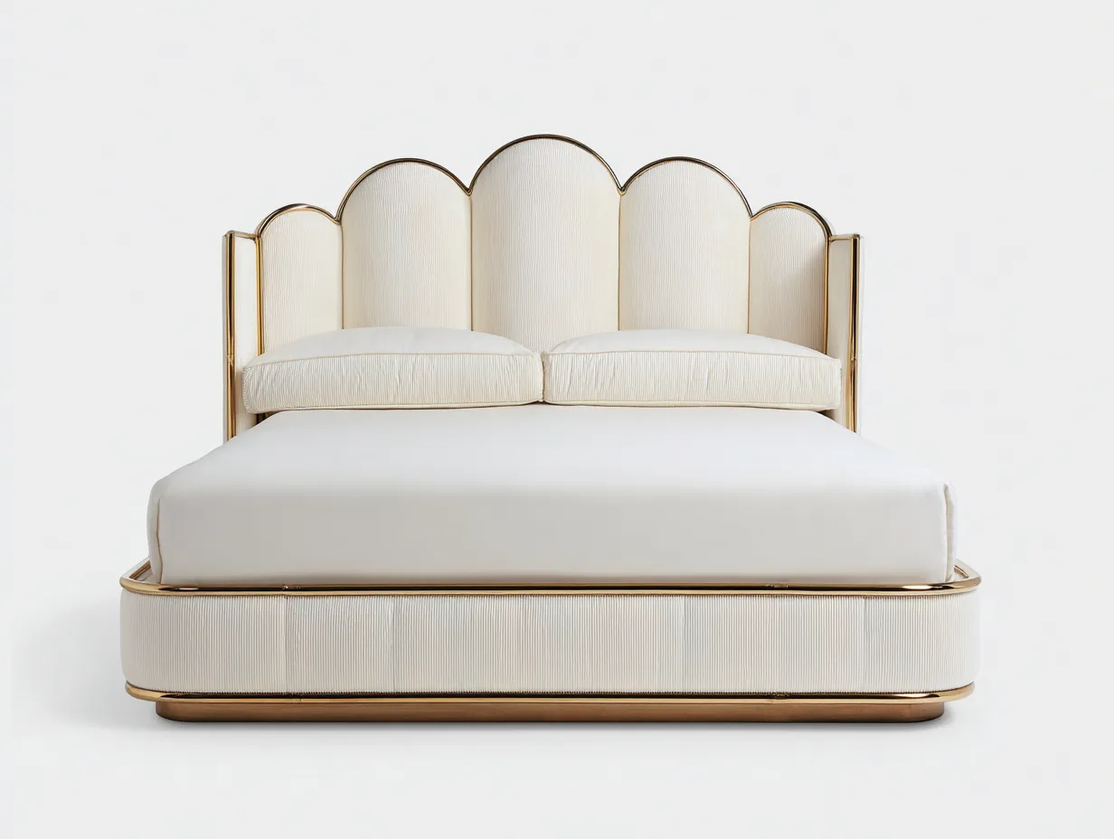 Structure du lit entièrement recouverte de tissu de couleur blanc, avec un rembourrage uniforme assurant confort et maintien. Les éléments décoratifs de couleur or soulignent les contours de la tête de lit et du cadre, offrant une finition soignée.