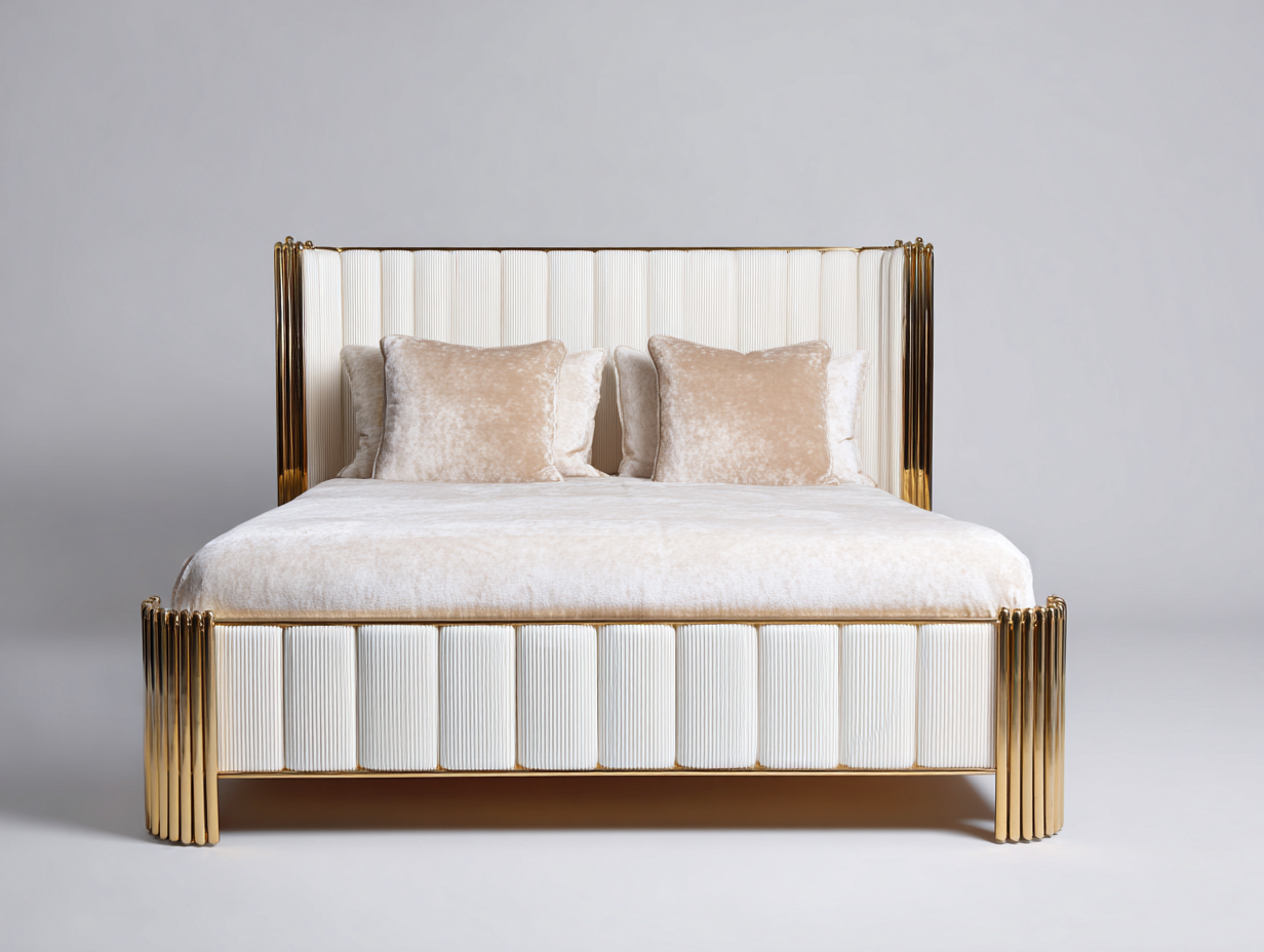 Cadre du lit recouvert de tissu de couleur blanc, avec rembourrage régulier offrant un confort équilibré. Les éléments structurels et décoratifs de couleur or soulignent les contours du lit et renforcent son aspect raffiné.